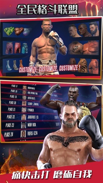 测试你的拳击技能,在《全民格斗联盟》的街机模式中对抗来自未来世界的老大,或者在地下锦标赛中施展你的技能,为你的拳击手解锁全新装备!