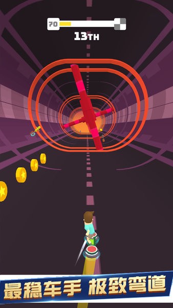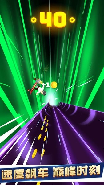 霓虹炫酷的跑酷玩法游戏,可以踩着飞行棋来进行冲刺,在赛道上很容易就能做出漂移动作,而且路上能够获取buff道具或者用来对付敌人的道具。