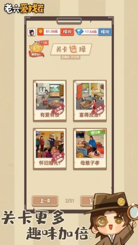 玩的过程中我还发现,游戏里的场景和关卡设计都很有心思,有些地方需要仔细观察才能发现线索,这种考验眼力的玩法真的让我欲罢不能。虽然有时候会遇到特别难的关卡,但那种挑战的感觉反而更让人想一直玩下去。总的来说,老六爱找茬确实是一个既烧脑又有趣的游戏,适合喜欢解谜和找茬的朋友来试试!