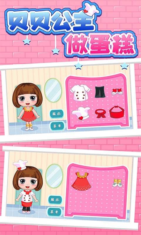 2、公主换装:给贝贝公主换上蛋糕师的衣服,让小朋友提高审美和化妆打扮能力。创意装扮游戏能帮助孩子发挥想象力,发展艺术设计上的表现力。