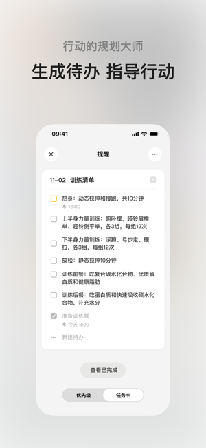 -- 待办指导下一步行动:笔记的真正价值不在于停留在纸面,更应该是后续迸发的自我成长与行动。通过智能卡片,AI 可以将你的想法整理成一个行动指南的待办事项,可以一键导入到系统的提醒事项,或者Things、Ominfcous等各种待办软件中。