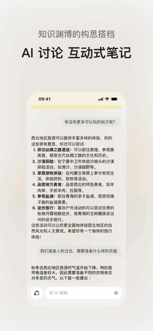 -- 与AI讨论: 一个好的想法,一个灵感往往是一个开端。基于你的灵感,你可以和聪明博识的 AI 进行对话和交流,在对话中你可以不断提问、讨论,在对话中获得启迪,最终形成更完整的想法,更多的纬度的思考。并且适当的时候,你会收到回顾想法的卡片,不断思考打磨你的想法。
