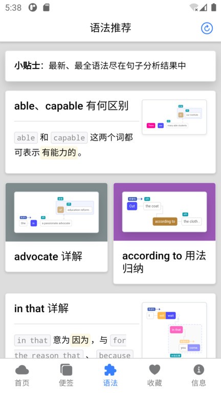 enpuz软件安卓最新版能够对英语的句子进行详细的分析,帮助用户提高英语的写作水平,有非常贴心的核心语法以及句型分析,有详细的分析结果展示,指出语法中存在的错误,可以在线查单词和进行拓展学习,可以收藏好句子,便于自己写作的时候灵活应用!