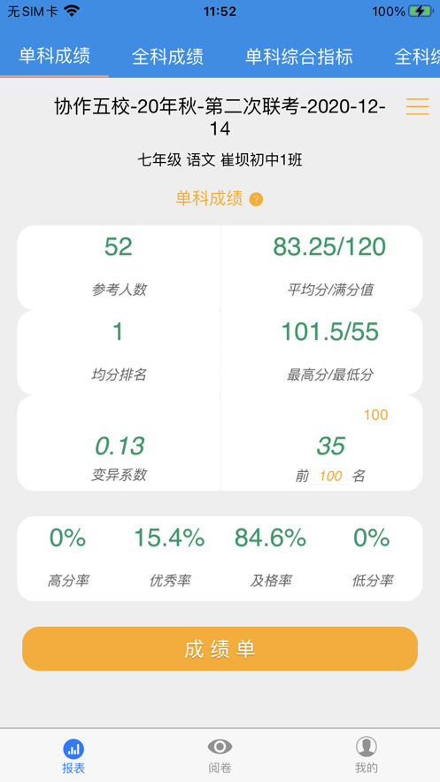 轻松查看单科成绩、全科成绩、单科综合指标、全科综合指标、教学诊断、试卷讲评、试题质量分析、分段统计、学科均衡性、团体发展趋势、学生进步度、教学加工能力等数据
