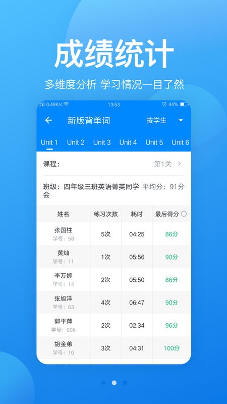 支持背单词、备考训练、绘本、口语等成绩统计。
