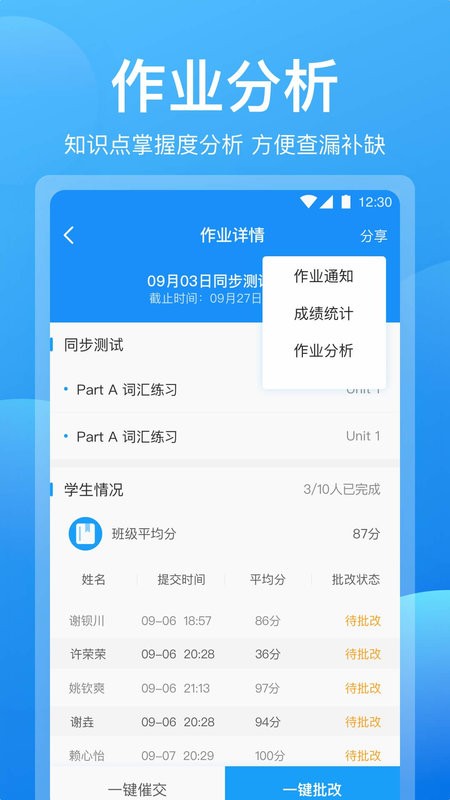 老师可以实时的了解学生的情况、作业的情况和成绩的数据!