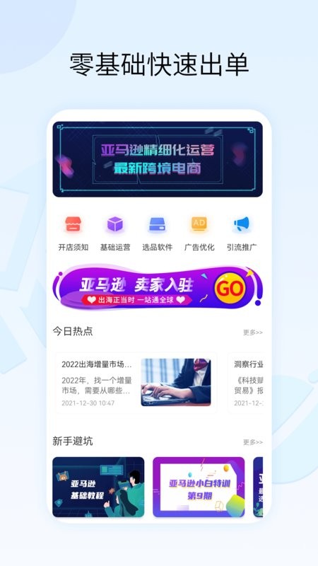 亚马逊跨境电商教学软件又称亚马逊跨境电商指南app,是亚马逊旗下官方打造的运营管理教学平台,面向广大的亚马逊卖家,小白也可以轻松上手,一键入驻,各种课程全面学习,循序渐进,从0到精通,掌握规则技巧,快速出单,适合不同人群使用!