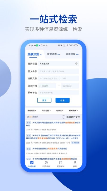 法询智库app是提供法律信息查询检索的应用软件,界面简单,内容丰富,涵盖全面的法律法规和专业级金融数据库,可以在搜索查询,清晰解读,了解相关案例,不断学习,更快掌握最前沿法规,提高效率,适合从事金融法律行业人员使用!