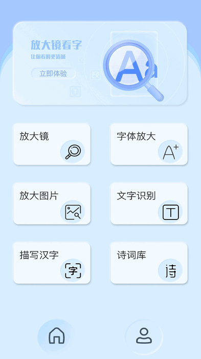 放大镜看字工具是一款放大图片和文字识别的软件。可以用来查看各种细小的文字,身边各种细微的事物,放大镜还能放大手机屏幕上的任何位置的任何信息,再也不用担心爸妈看不清手机上的字了。
