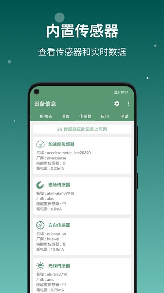 8、传感器:手机上所包含的所有传感器的信息;
