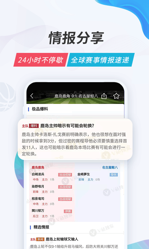 v站是一款涵盖全球足篮球赛事动画、比分数据、赛事资讯、名家分析的APP。我们提供世界上超过200多个国家和地区的足球篮球赛事即时数据、动画直播、赛事数据和球队资料等信息。