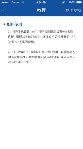 1、打开手机设置--wifi--打开-找到我司设备wifi名称--连接--密码1234567890,连接成功后打开我司APP(名称HIHZ)即可使用。