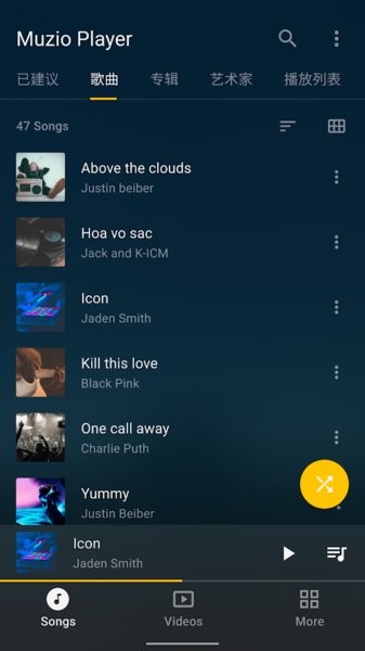 选择好主题之后,紧接着便来到了音乐播放器的主界面,在这里你可以选择自己喜欢的歌曲、专辑、艺术家,也可以查看当前的播放列表。