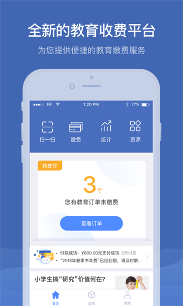 1、教育费用支付提醒,阅览到订单,迅速就能查询并且缴费;