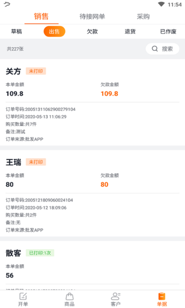 单据可编辑为草稿、出售、欠款、退货、已作废等,订单状态一目了然