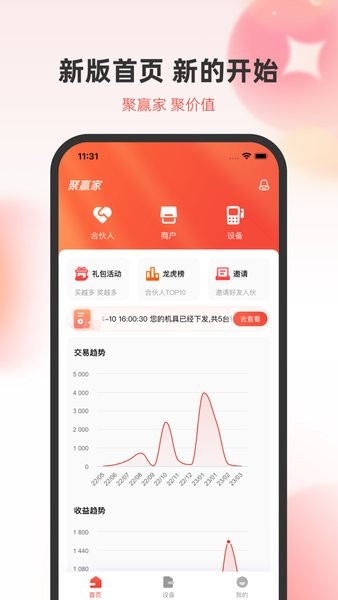 聚赢家主要是为合伙人提供高效展业服务支持,能够在APP中实时管理商户、终端、下级合伙人信息,可实时查看各维度数据,了解最新的团队展业情况,灵活配置政策方案,我们将以稳定的平台为用户提供安全可靠,高效便捷的服务。
