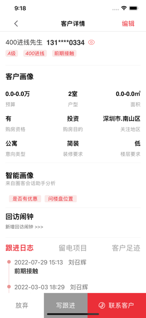圈客APP是一款服务房地产经纪人的客户管理APP,实现客户轨迹追踪分析、跟进提醒、客户转化分析、团队管理、客户流转等功能集合的经纪人成交转化工具,提高客户转化成交效率,专为经纪人打造的客户管理平台!