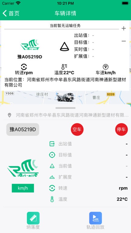 慧砼帮手机软件能够对车辆进行追踪管理,可以查看详细的行程轨迹,回放方便,可以输入车牌号查询指定车辆,当前值目标值以及出站值一目了然,还能够查看详细的坍落度变化曲线图。