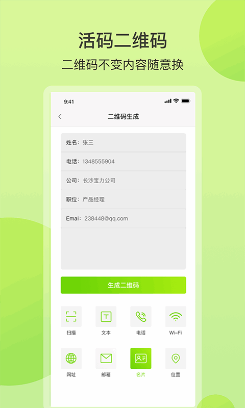 1、广泛生成,论是文本、通讯录、邮件、电话、名片、网址只要是你想生成的都可以生成。