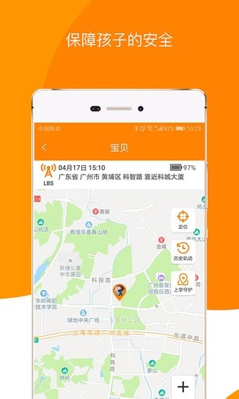 进入实时定位页面,查看地图并点击上学守护、历史轨迹等