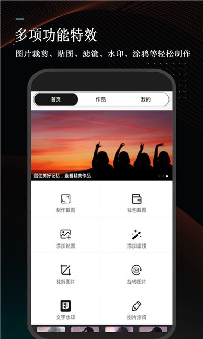 万能微商截图王手机版提供了非常贴心便利的图片处理功能,可以对图片自定义剪裁、涂鸦,还能自定义编辑文字内容,同时还有多重滤镜和水印模板能够使用,轻轻松松就能制作出精美的营销图,再也不用担心没素材发朋友圈啦!