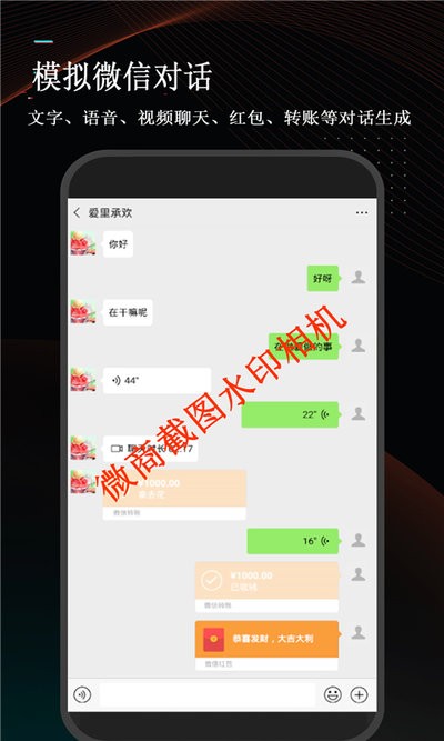 支持各类社交软件如微信、qq等单聊、群聊图片制作,轻松制作微商聊天对话、转账记录、账户余额、账户提现、表情对话等多种形式截图,搞怪有趣。