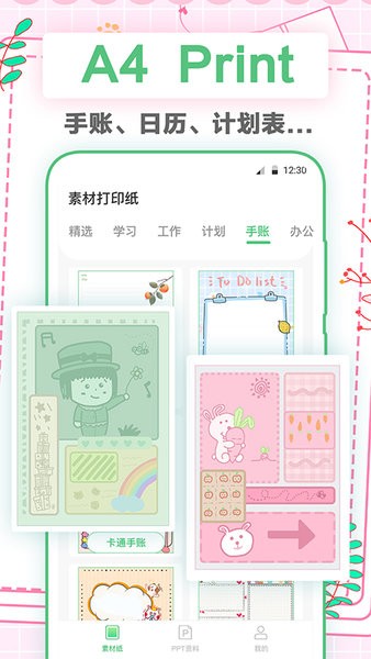 a4打印纸大全app,有丰富的模板资源,涵盖基础、工作、学习、计划、手账等诸多分类,适合各种场景各种需求!
