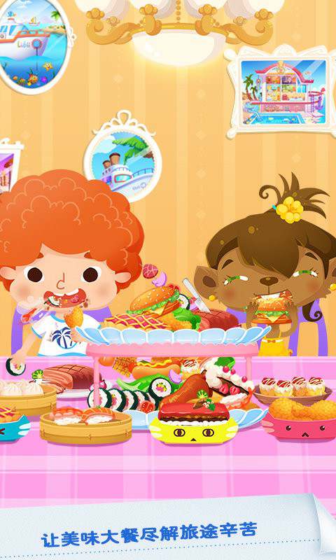 3.游戏玩累了,接着来到餐厅为客人们准备一顿大餐吧~汉堡、大虾、烤串、水果……各种各样的食物出现在你面前的传送带上,将它们逐一拖入盘中吧,争取在规定时间内为玩累了的游客们准备一份大大的惊喜,叠的越高吃的越多哦。