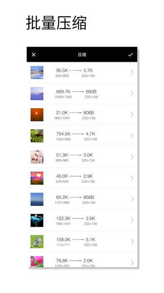 1、能够根据需求对照片进行自定义尺寸裁剪,一键选中多张图片就能批量压缩,省时又省心;