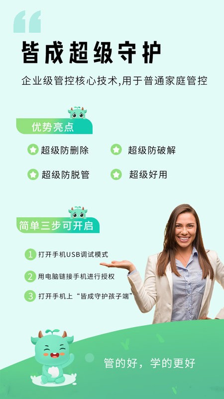 -- 升级超级模式,将政府、军队等企业级管控核心技术用于普通家长守护,防删除,防破解,防脱管,真好用。