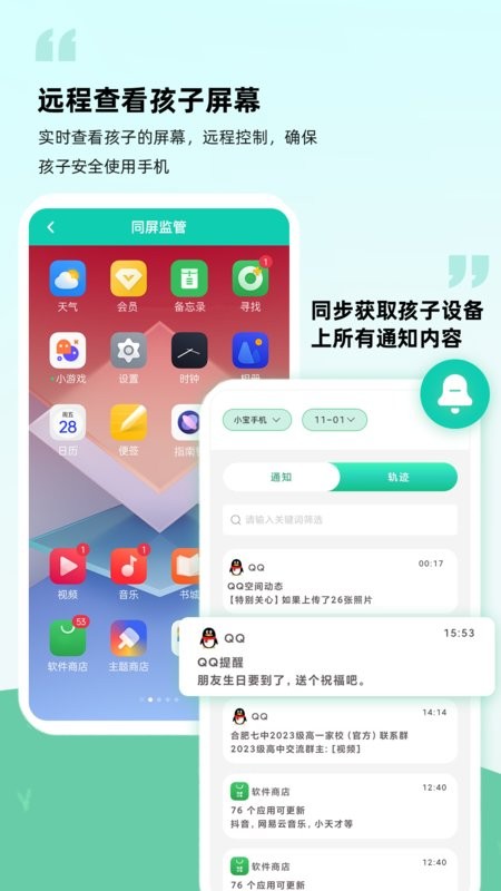 -- 自动获取孩子设备上所有通知内容,及时预警,确保孩子安全使用手机。