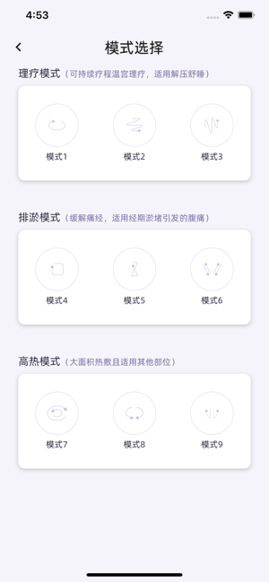 蓝牙检索连接成功后,可以对暖宫带进行温度调节,定时设置、九种模式选择及设备使用记录统计;