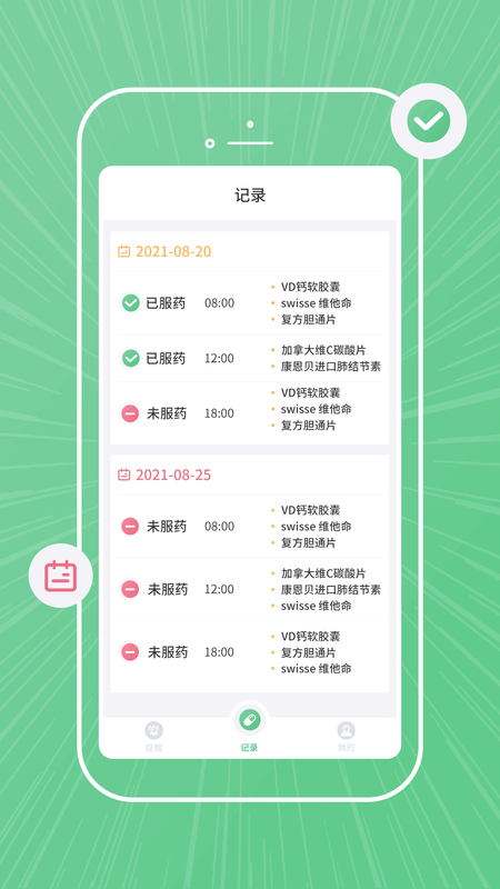 3、监测吃药进度;记录已服用和忘记服用的药物信息