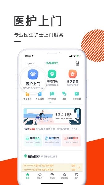 泓华的医护上门及送药到家服务遍布全国330多个城市2300个区县,医护上门、护工服务和24小时远程视频问诊结合,提供家庭病床、巡诊、居家康复护理、送药到家、老年健康定期巡护等服务,泓华成立以来,严格按照国际JCI标准,构建了以客户为中心的医疗安全质量服务体系,为国内外客户提供医护上门、视频门诊、送药到家、家庭护理、健康体检、私人医生、专家会诊、共享诊室、居家养老、慢病管理、 海外医疗、互联网智慧医院、互联网智慧药店、互联网智能养老平台服务等