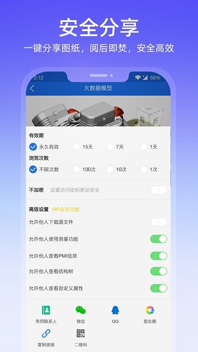 可以将手机或电脑本地3D模型和CAD图纸一键分享给他人,提供【公开】和【加密】分享。