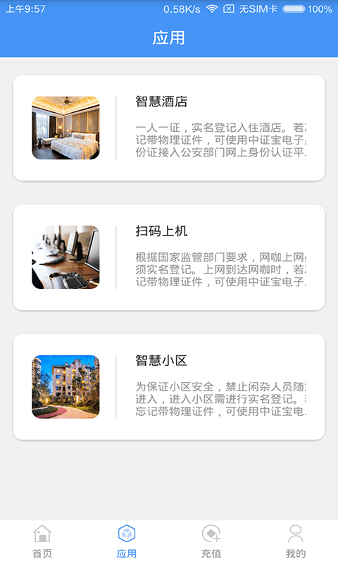 中证宝是一款实名制认证生活服务软件,经过实名制认证后用户可在网上充值消费,使用方便快捷、安全,历史消费记录一目了然。中证宝app客户服务快速解决用户的疑问,为您提供智慧酒店、扫码上机、智慧小区等方便应用,支持一键实名认证,飞速提供您的身份码,无论网吧上网或入住酒店均可使用,从此以后外出不需要带实体证件!