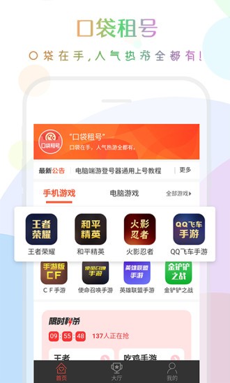 口袋租号是一个专为游戏玩家打造的账号租赁平台,提供海量热门游戏账号和贴心服务。不管你是找手机游戏还是电脑游戏的账号,在这里都能轻松找到。而且还有很多优惠活动,比如租两小时送一小时,租三小时送两小时,价格实惠,还支持多种支付方式。