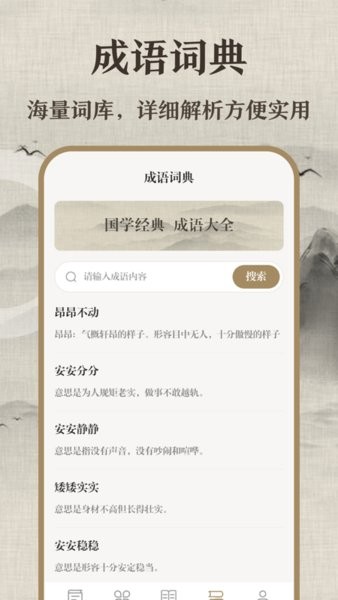 app里还有成语词典功能,海量成语都能查到,拼音解释、用法样样齐全,孩子学习起来超方便。深度解析部分更是让我觉得惊艳,不仅有注释和译文,还配了赏析和古风插图,让孩子彻底搞懂每首诗的背景故事。