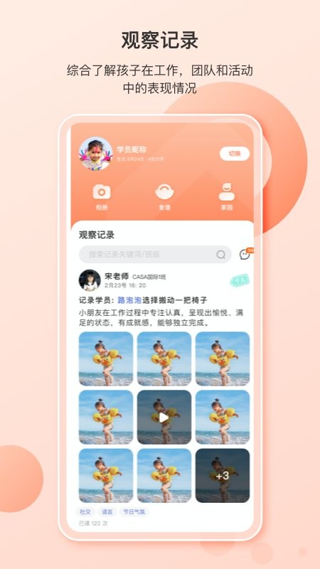 蒙氏家园是蒙氏手记的家长端产品,当老师在蒙氏手记中完成蒙氏家园的绑定后,家长就可以通过蒙氏家园,轻松了解孩子在学校的学习进度、能力水平、精彩瞬间。