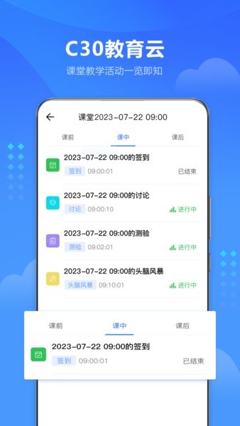 C30云课堂是一款自主学习/练习的移动工具,拥有优质的课程资源,支持在线学习、在线考试以及参加各种课堂活动。能够快速的掌握学生学习考试情况,实现数据汇总,极大的方便了学生学习。