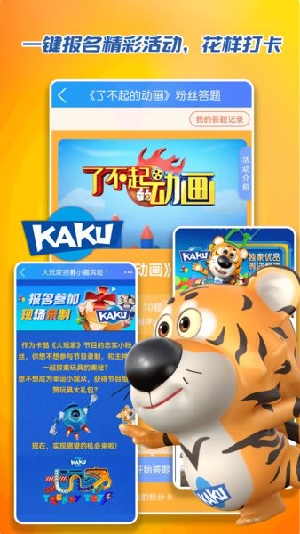 卡酷KAKU APP由北京广播电视台卡酷少儿卫视重磅推出,是一款针对4-14岁儿童家长需求开发的成长陪伴类产品。卡酷APP基于官方优质资源,聚集节目互动、优质活动、素质教育、商城售卖与智能伙伴“酷虎”等功能,是家庭活动的优选专家与孩子的成长伙伴。