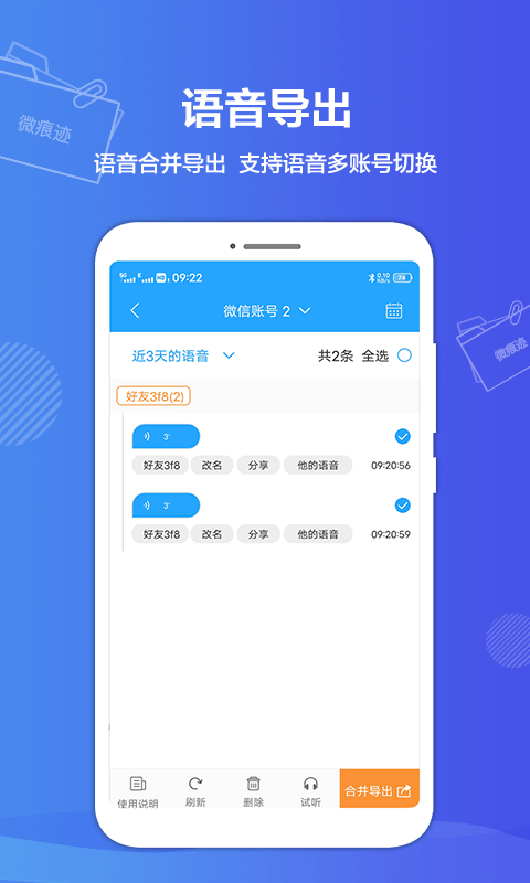 6、丰富的语音文档管理工具,支持发送、删除、导出或合成等功能;