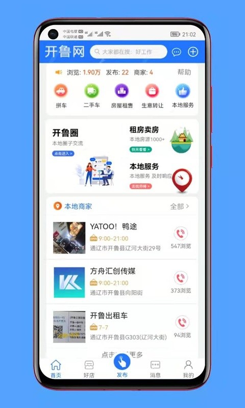 开鲁网,专为开鲁本地居民打造的本地生活服务软件,居民可便捷在线寻找附近的优惠商城信息,享受便捷的同城购药、外卖服务,还可以便捷在线寻找工作兼职以及租房信息,十分方便,有需要的居民可以下载使用!