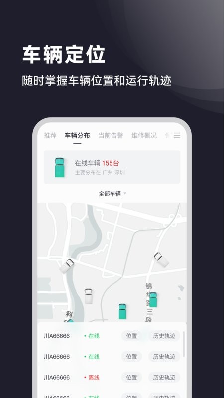 厂家资讯、车辆分布、当前告警、维修概况、保养概况、配件查询、车队管理、停留点管理、成本与收益测算;