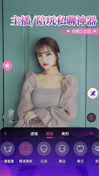 精细磨皮美白,亮眼白牙,大眼瘦脸,细高鼻,让你素颜也能在微信视频通话中展示完美网红脸,美白嫩肤打造少女肌