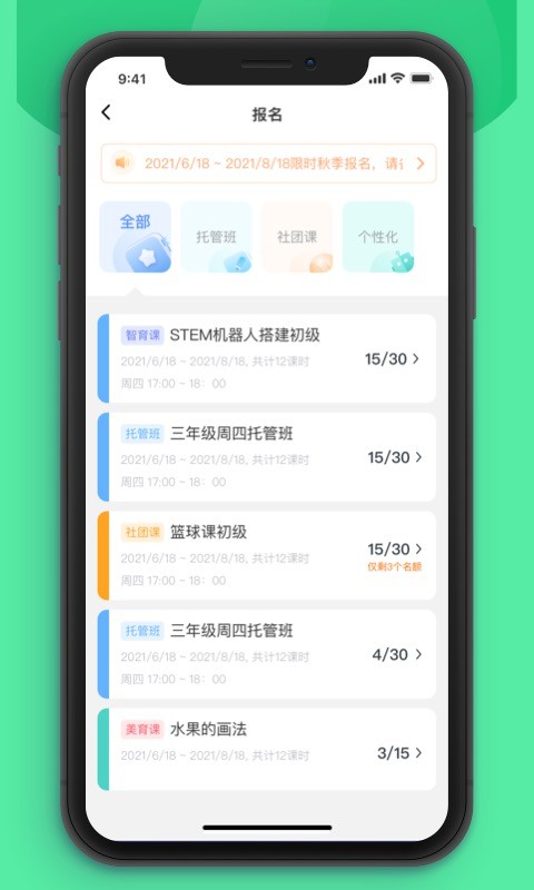 课后延时服务管理平台最新版app为广大的家长用户提供了孩子课后托管服务,这里有丰富的课后班课程可以选择,包括编程、篮球、绘画等,包括托管课程以及社团课程,支持在线报名,能查看详细的课程安排时间表以及剩余的名额。