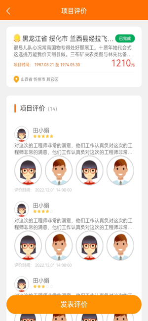 -- 功能描述:项目完成后,雇主和工程师对彼此的服务质量进行评价。