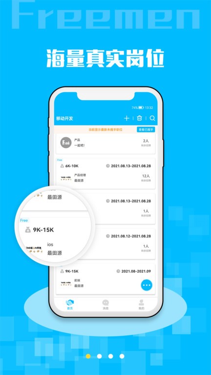 freemen招聘软件非常适合程序员找工作,这里有非常丰富的程序员招聘岗位,这里也汇集了一群技术人员,求职者可以轻松找到满意的工作,企业能够找到适合的企业人才,能够和项目负责人直接沟通。