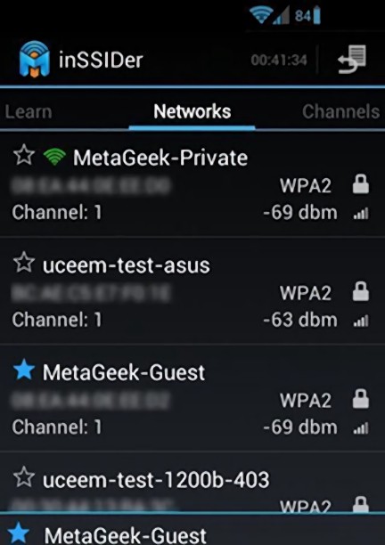 inssider是全球著名的WiFi网络搜索软件,包含了网络名称、加密方式、无线传输速率等主要的信息等,用户可以通过该软件快速的找到用户周围的热点和MAC地址,可以在房间来回走动来确定信号方向,然后使用CDLINUX或BT5进行破解。inssider破解版能够显示所检测到的网络,所使用的信道、硬件平台、信号强度等。