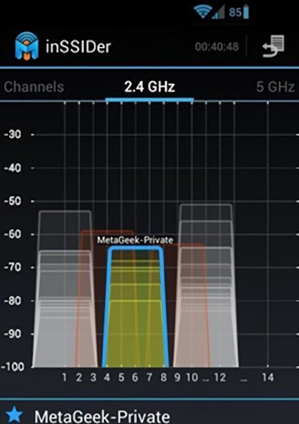 查看2.4GHz频段信道使用情况,这是inSSIDer非常有亮点的一个功能(纵坐标:信号强度,横坐标:14信道)。在这里我们不仅可以看到每个无线热点所占用的无线信道,还能看到该热点的信号强度。此时,信号强度强,占用信道不拥挤的无线热点就是你的选择。
